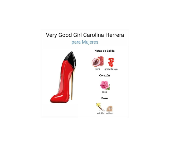 O perfume feminino Very Good Girl leva você a uma jornada olfativa surpreendente. Com um floral frutado marcante, a fragrância tem como destaque nas notas de saída a groselha e a lichia exótica, para um atrevimento doce e viciante. Ao centro, as notas de coração levam à rosa sedutora e elegante. Como base, as notas de vetiver e baunilha dão um toque final de sofisticação e intensidade.
